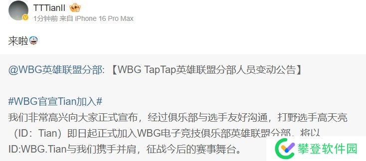 Tian转发WBG官宣加盟微博:来啦!