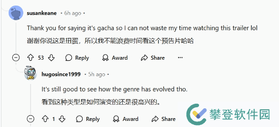 也有玩家表达了对游戏类型的失望:“谢谢你们提醒它是抽卡游戏,这样我就不会浪费时间去看这个预告片了,哈哈。”然而,也有部分网友对该类型游戏的发展表示肯定:“尽管这些游戏很相似,但仍然值得一看,看看这个类型是如何发展的。”