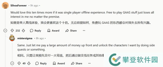 一些玩家则表达了对游戏形式的偏好:“如果这款游戏是单机离线的,我会更喜欢它十倍。免费的GAAS类型游戏已经彻底失去了我对它的兴趣,不管它的设定如何。”