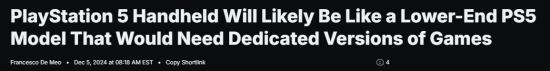 Digital Foundry(数毛社)的技术专家分析称这款掌机可能无法原生运行PS5游戏,因为目前在200瓦PS5主机上实现的功能即使在几年后也不可能在20瓦的掌机硬件上实现。所以,为了让游戏在这款掌机上运行,可能需要对游戏进行缩减处理,类似于任天堂Switch在掌机模式下的运行方式。其认为,索尼已经展示了如何通过PS5 Pro实现画面提升,因此缩减画质应该不是不可能的。