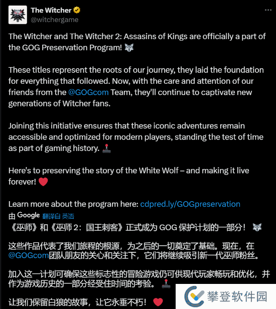 此前本站曾报道,CDPR旗下的GOG平台推出经典游戏保护计划。今日《巫师》官推发文称,《巫师1》和《巫师2:国王刺客》均已加入该计划。