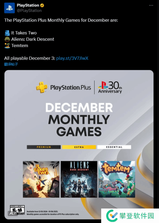 PlayStation Plus公布欧美服12月新增会免游戏:《双人成行》《异形:坠入黑暗》《Temtem》三款游戏将于将于12月3日开放领取。