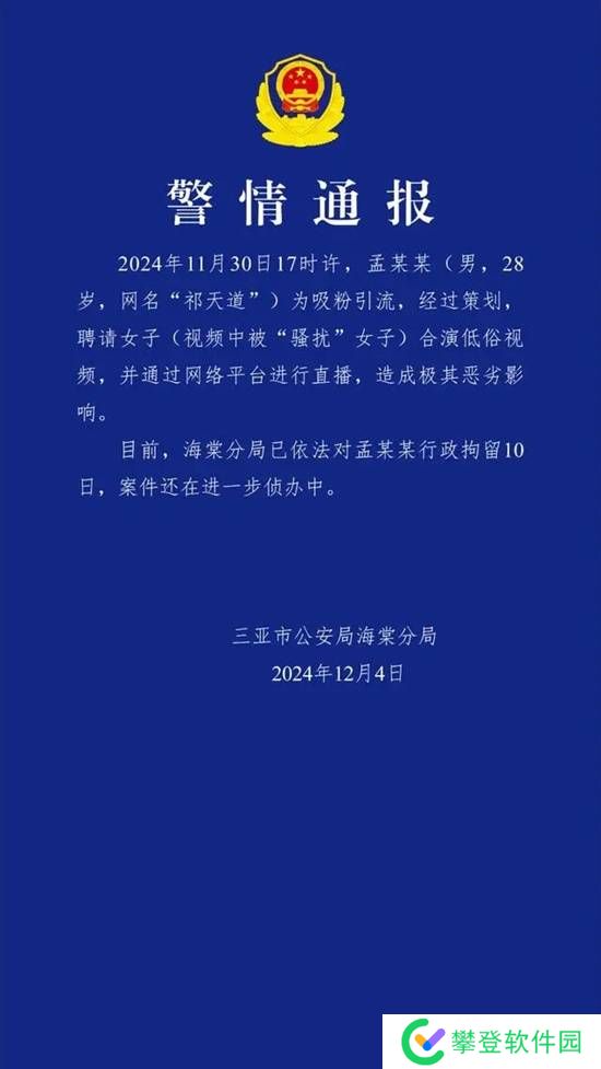 12月4日,三亚市公安局海棠分局发布警情通报:2024年11月30日17时许,孟某某(男,28岁,网名“祁天道”)为吸粉引流,经过策划,聘请女子(视频中被“骚扰”女子)合演低俗视频,并通过网络平台进行直播,造成极其恶劣影响。目前,海棠分局已依法对孟某某行政拘留10日,案件还在进一步侦办中。
