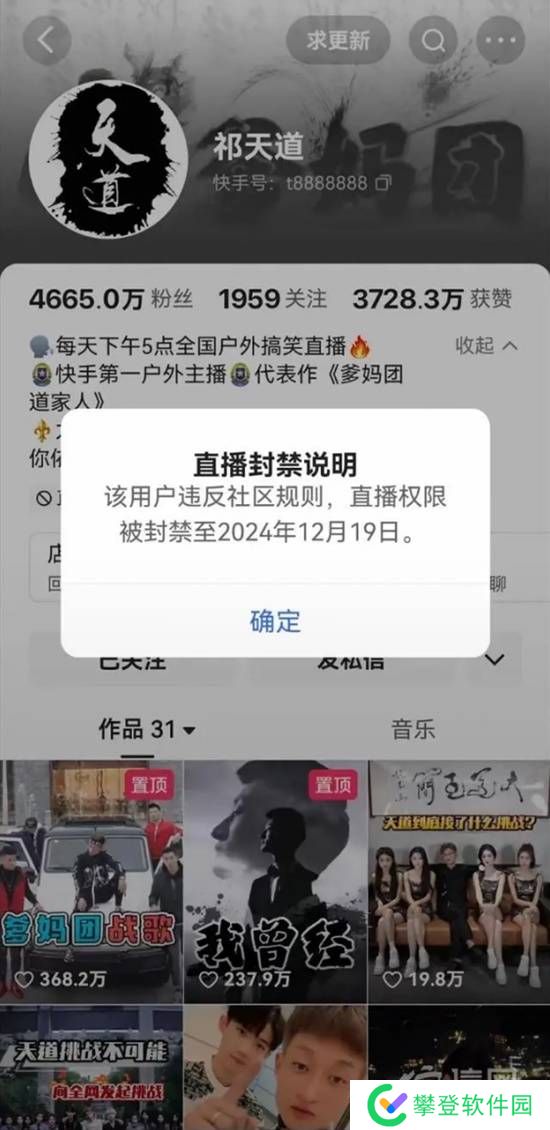 公开信息显示,“祁天道”在快手拥有4665万粉丝,简介称是快手第一户外主播。此前,该用户因违反社区规则,直播权限被封禁至2024年12月19日。今日,有媒体发现网红祁天道账号已被封禁。