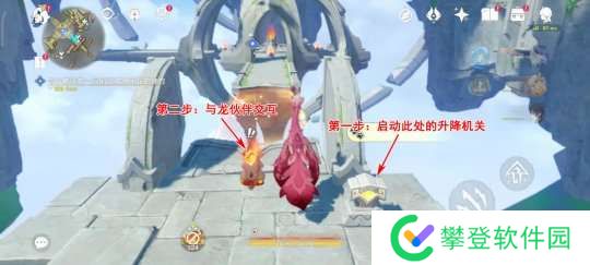 ◆跟随龙伙伴前往平台尽头,启动平台右侧的升降机关形成通路,与龙伙伴交互并前往玻娜所在的位置。