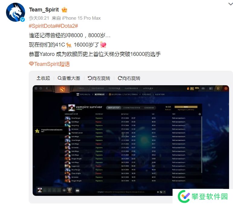 近日,Team_Spirit官方微博发布一条消息,Yatoro 成为欧服历史上首位天梯分突破16000的选手。