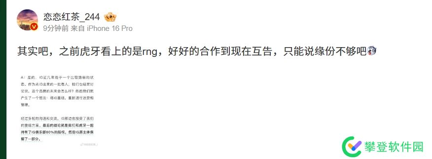 直播吧12月10日讯 近期iG官宣了重组,并组建了全神班阵容,氧望体育创始人安杰也接受了国内媒体的专访。对于专访的内容,恋恋红茶感慨到,此前虎牙在投资iG之前是投资RNG,两个战队从好好合作到现在对簿公堂,只能说缘份不够吧!