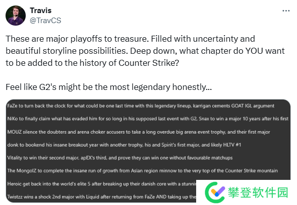 英国CS评论员兼分析师Trav在个人社交媒体账号上发表了对本届上海Major八强淘汰赛的看法与期待。在他看来,八强淘汰赛充满了不确定性和潜在的精彩环节,绝对是一轮值得珍惜的赛事。
