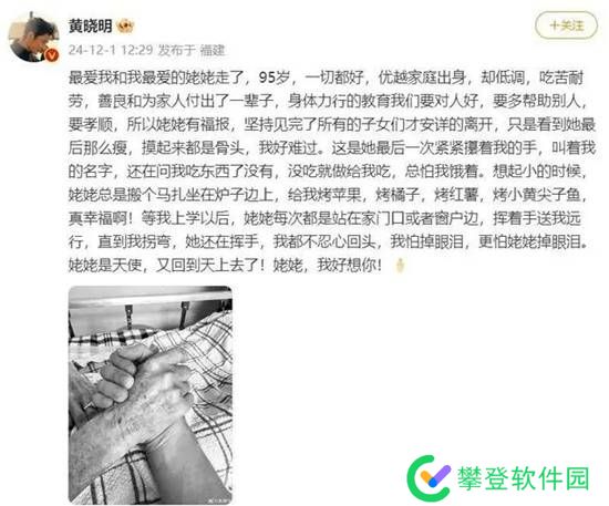 12月1日,黄晓明发文悼念自己的姥姥。称最爱我和我最爱的姥姥走了,95岁,一切都好。