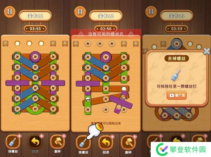 在游戏界面下方,设有若干功能按钮:拔螺丝、回退和敲碎