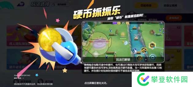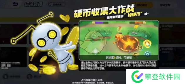 2、玩法介绍:地图中央会随机刷新硬币,训练家双方将在地图中央争夺硬币,通过拾取,击杀抢夺,率先,收集十枚硬币以上并坚持二十秒即可胜利,需注意,进入二十秒倒计时时,双方会获得一个加速buff,拾取硬币会回复一定血量,但会短暂降低移速,并且训练家被击杀时,手中的硬币将会掉落。