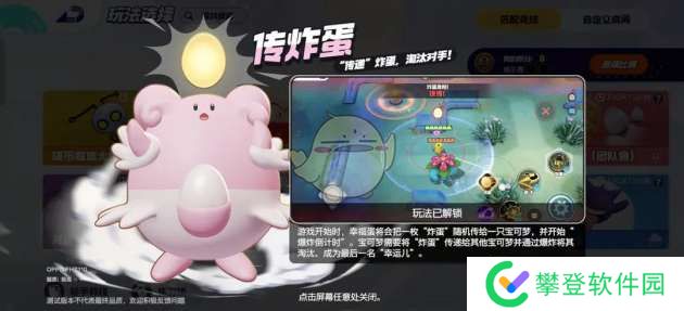 2、玩法简介:游戏开始时,幸福蛋将会把一枚“炸蛋”随机传给一只宝可梦,并开始“爆炸倒计时”。宝可梦需要将“炸蛋”传递给其他宝可梦并通过爆炸将其淘汰、成为最后一名“幸运儿”。