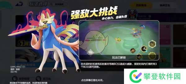 2、玩法简介:在强敌大挑战中,3只因亿奥斯能量的力量变得强大的头目宝可梦会接连登场,需要在规定时间5分钟内打倒它们。