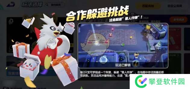 1、玩法简介:两人组队通过躲避图中由信使鸟随机投放的“雪人炸弹”而取得胜利的生存赛,4支队伍8只宝可梦,存活到最后的一支队伍获胜。