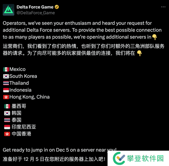 今日,官方宣布,为响应玩家需求,他们额外增设了墨西哥、韩国、泰国、印度尼西亚以及中国香港的服务器,力求为玩家提供更好的网络质量。