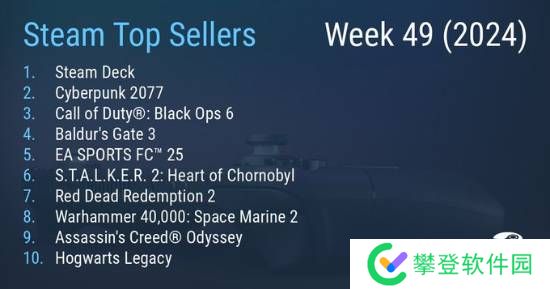 新一期Steam周销榜公布,Steam Deck重回榜首,《赛博朋克2077》荣登第二,新发售的《潜行者2:切尔诺贝利之心》则来到了榜单的第六名。