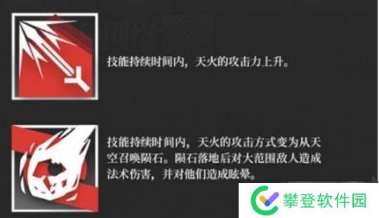 当天火精英化后,她会增新增二技能“天坠之火”。该技能生效期间,天火的攻击方式会转变为从空中召唤陨石火球,陨石会对大范围的敌人造成法术伤害并使他们陷入眩晕。同时兼具了输出和控制的双重效果。也正因为这个第二技能,天火在团队中的作用比起一般的术师干员来说强势了许多。