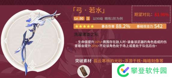 五星武器下位替代中比较契合恰斯卡的一把武器,除去生命值的收益之外,触发条件极其简单,能够吃满其他所有收益,但依旧与专武差距较多的主要原因本质上时白值较低,在携带3位契合属性的角色入队本身固有天赋提供65%的「焕光追影弹」造伤害加成,加上【黑耀秘典】提供的15%元素伤害加成,若水这低白值的情况下,20%的伤害加成带来的收益就有些稍微不够看了。