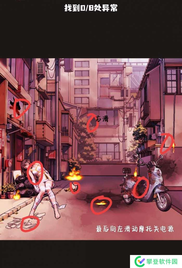 这一关是在火灾现场,需要在图中找到8处异常,具体不正常的地方如下图: