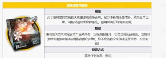 在手机游戏《明日方舟》中,理智药剂“应急理智浓缩液”可以通过完成每周任务获得奖励或者赠送获得。