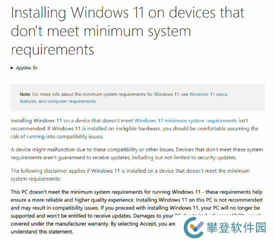 根据Neowin的报道,微软更新了其关于在不支持的硬件上使用Windows 11的页面。如果系统检测到用户的设备不符合要求,屏幕上将显示一个水印提示,微软更新的免责声明提到:“此设备不符合Windows 11的最低系统要求。这些要求是为了确保提供更可靠、更高质量的使用体验。不建议在此设备上安装Windows 11,因为可能会导致兼容性问题。如果继续安装Windows 11,您的设备将不再获得支持,并且无法收到更新。缺乏兼容性导致的设备损坏不在制造商保修范围内。”